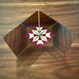 With a hinged mirror, place one puzzle piece at a time in the right angle centre/corner point. Observe the pattern created in the mirror and how it changes each time you rotate the puzzle piece.